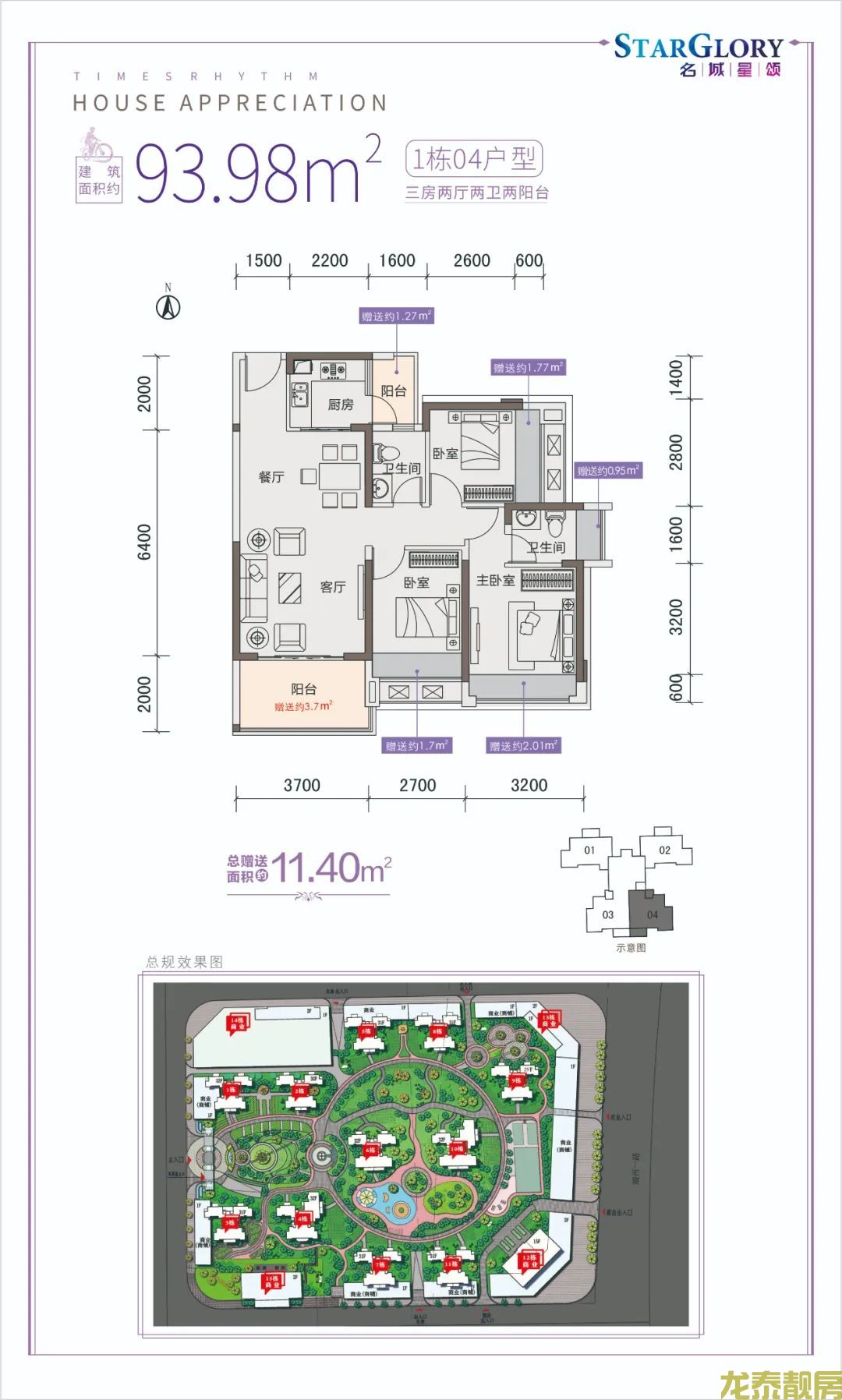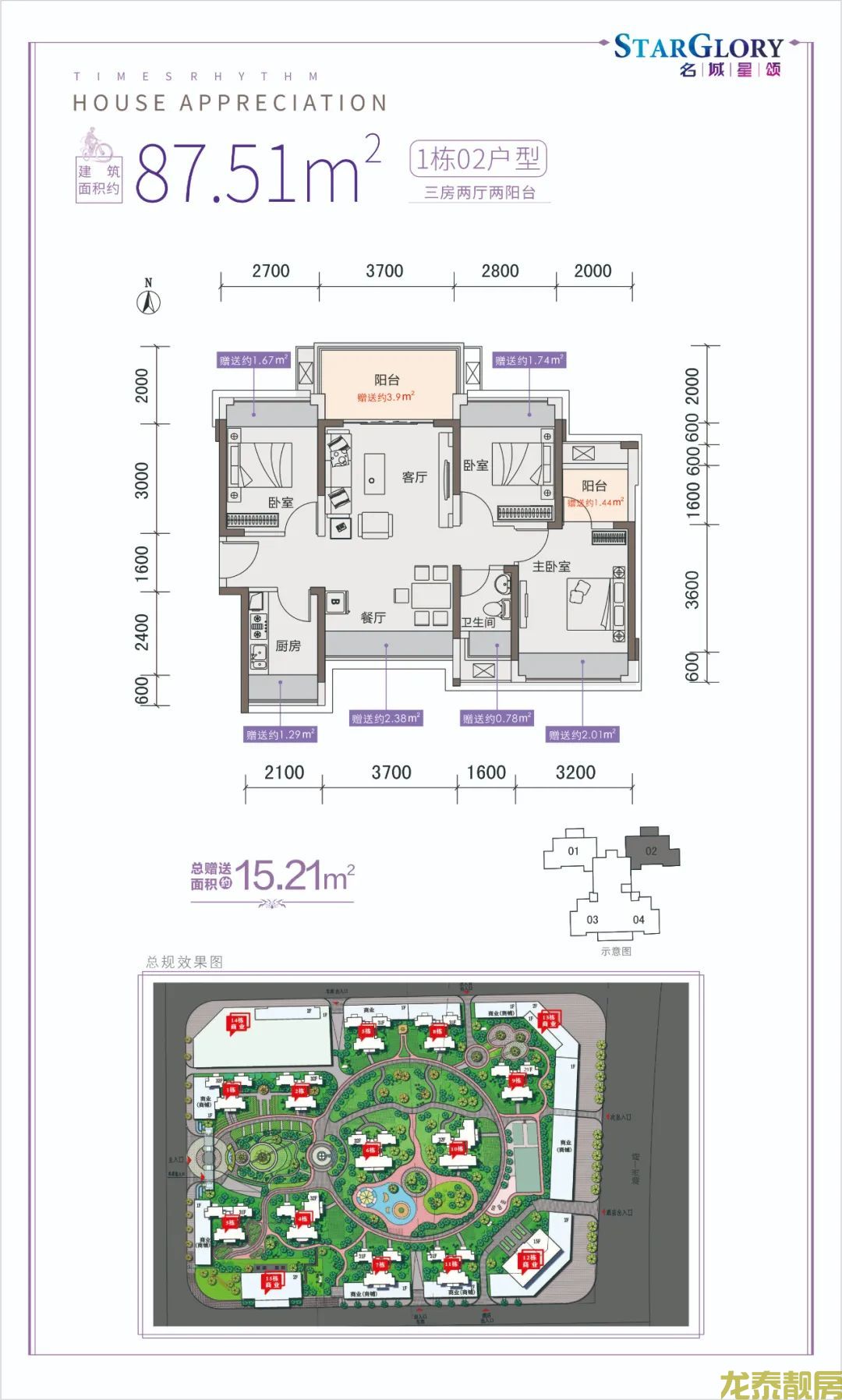 户型鉴赏 户型方面,全新1栋延续此前“实用、方正”的轻奢风格,主打建面约87-94平方米经典户型。 1栋01-02户型—— 该单位赠送面积高达15.2平方米。南北朝向、3.7米开间客餐双厅、餐厅房间赠送飘窗台、厨房方正实用。约13.5平米的主卧,连接赠送的独立阳台,轻松拓宽生活空间。